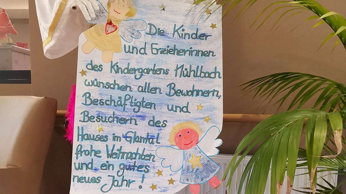 Der Kindergarten Mühlbach überraschte das „Haus im Glantal“ mit einer rührenden Geste. Zu Fuß kamen die Kinder mit zwei Erzieherinnen zu der Altgenglaner Pflegeeinrichtung sparziert und hatten dabei selbstgemachte Bastelarbeiten im Gepäck. Passend zu Weihnachten arbeiteten die Kinder an vielen kleinen Schmuckstücken, die sich perfekt zum Dekorieren anbieten. Zusammen mit einem Plakat verpackte man alles in zwei eingepackten Geschenken und überreichte es Margit Formbach, Leiterin der Sozialen Betreuung. Corona geschuldet konnten die Kinder es leider nicht selbst den Bewohner*innen überreichen. Nichtsdestotrotz war die Freude über die gebastelten Engel, die zotteligen „Weihnachtswichtel-Köpfe“ und viele weitere Besonderheiten riesig. So riesig, dass man sofort damit begann, mit einzelnen Bewohner*innen den Eingangsbereich mit neuen Geschenken zu schmücken. Noch bis zum Nachmittag half man den Bewohner*innen, die nicht mehr so gut zu Fuß sind, sie nach unten zu bringen, um sich die Werke der Kinder anschauen zu können. Was für eine tolle Aktion vom Kindergarten Mühlbach. Herzlichen Dank!