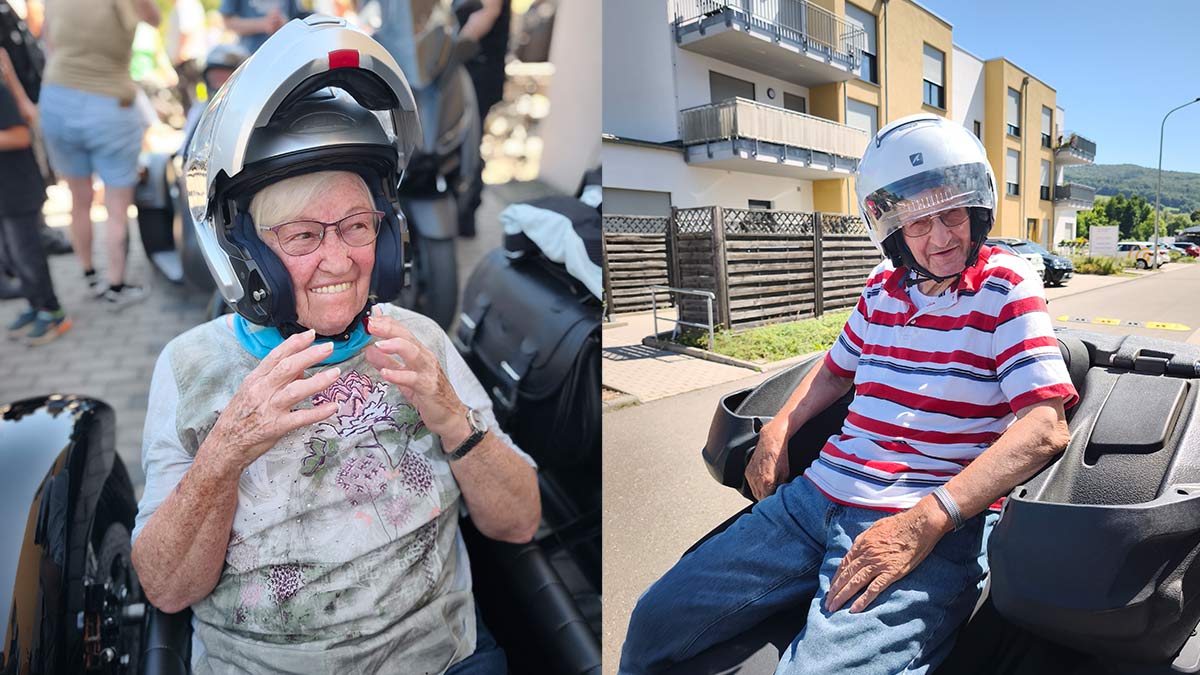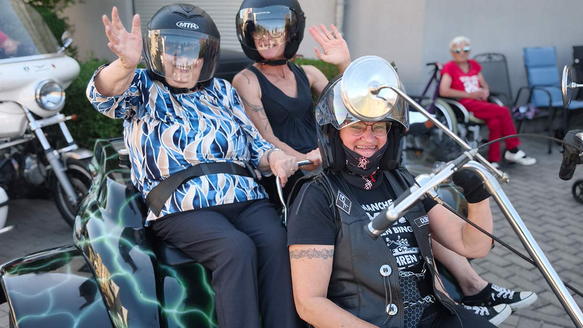 Im „Haus im Glantal“ in Offenbach-Hundheim hat Betreuungskraft Margit Frombach gemeinsam mit dem Motorradstammtisch Glantal eine Ausfahrt geplant, die alle Herzen höherschlagen ließ. 20 Motorräder, Trikes und Quads holten einige Bewohner*innen, die an der Aktion teilnehmen wollten, vor der Pflegeeinrichtung ab und nahmen sie mit auf eine 30-minütige Tour durch das wunderschöne Glantal. Das Knattern der Maschinen. Der Fahrtwind im Gesicht. Die endlosen Straßen. Und plötzlich waren die Erinnerungen wieder da – an all die Touren, die die Bewohner*innen früher selbst gefahren sind. Für einige war es jedoch ein völlig neues Gefühl. Auf jeden Fall brachte die Aktion ganz viele strahlende Gesichter zum Vorschein. Die Menschen am Straßenrand winkten den Senior*innen zu, viele Angehörigen und Neugierige kamen zur Einrichtung, um bei der Aktion dabei zu sein. Das Gefühl von Freiheit machte diesen Tag zu etwas ganz Besonderem. Da der Andrang groß war und viele Bewohner*innen mitfahren wollten, wurde auch noch eine zweite Runde gefahren. Mit Unterstützung der Mitarbeiter*innen konnten sich die Bewohner*innen problemlos auf die Bikes oder in die Beiwagen setzen. Sie wurden mit Helmen und Sicherheitsgurten versorgt – safety first! Zurück im Haus gab es für die Bewohner*innen wie für die Biker*innen eine Stärkung: ein kleines Grillfest mit leckeren Würstchen, Salaten und kühlen Getränken ließ den Tag bei guter Stimmung ausklingen.